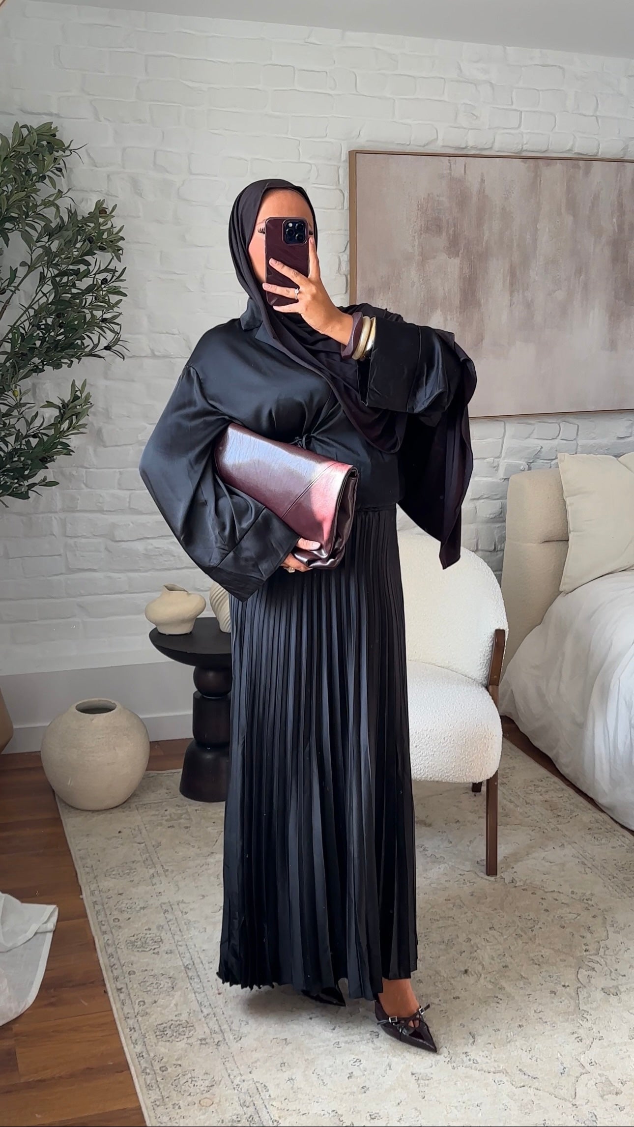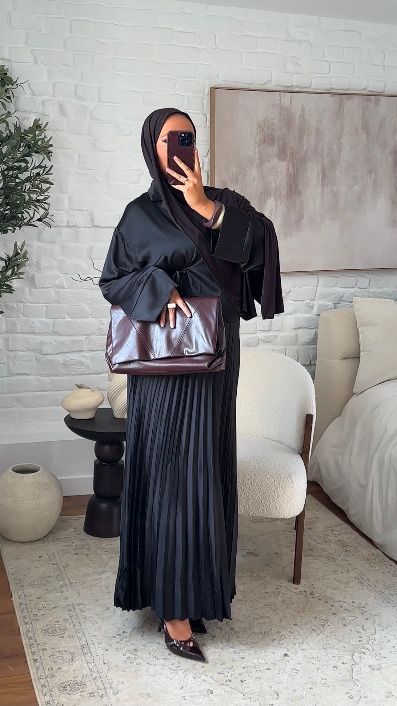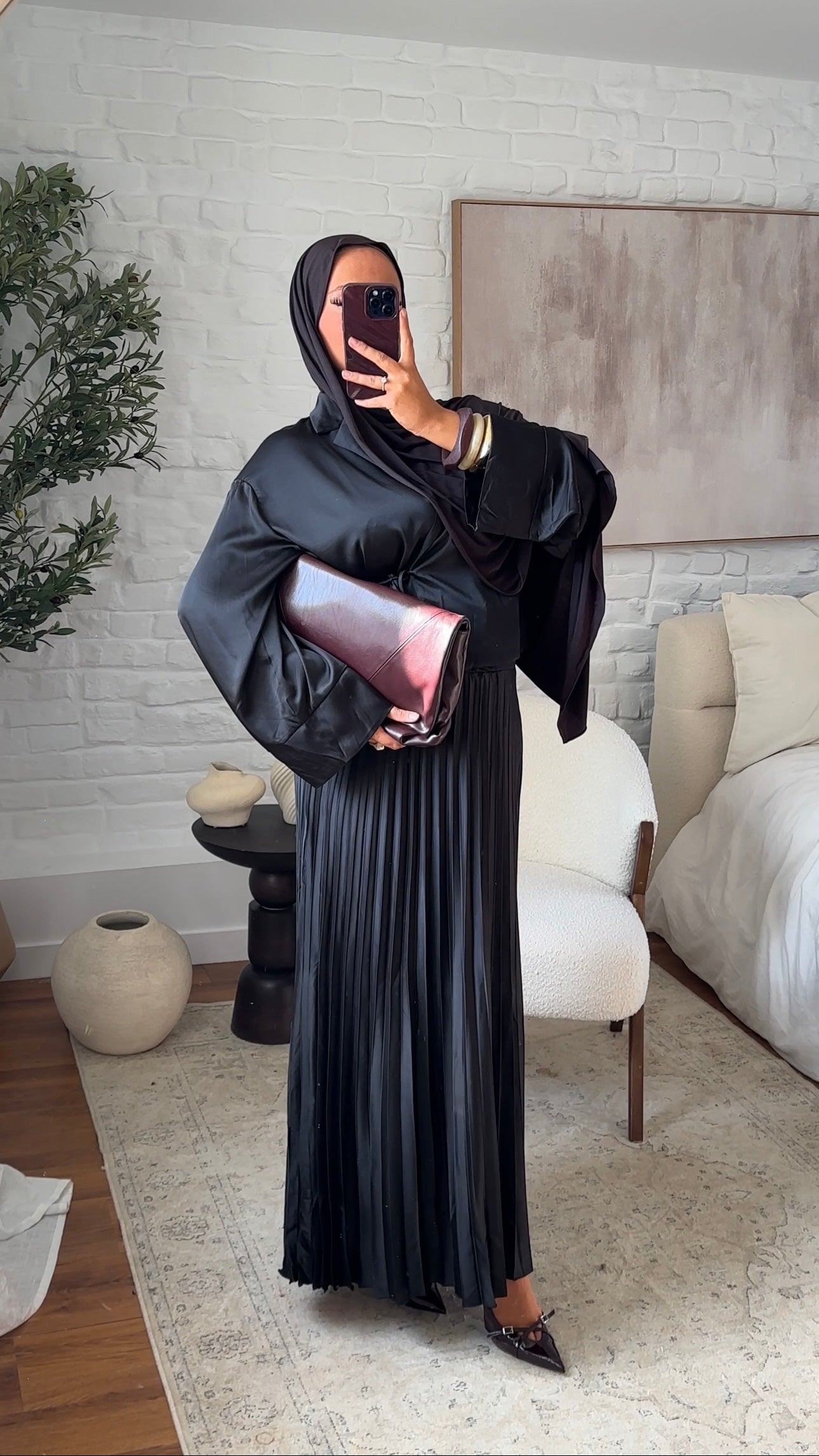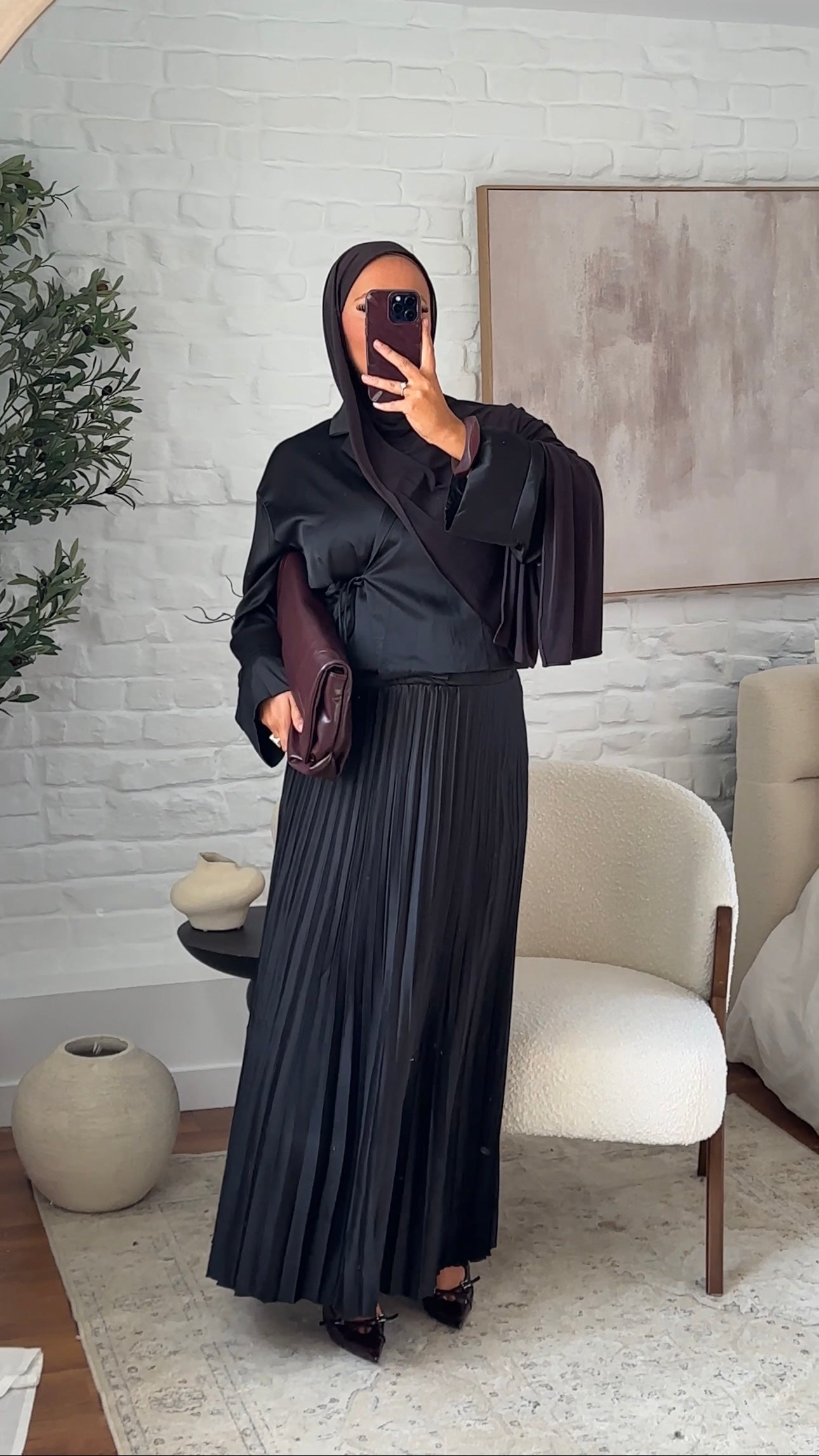 Ensemble deux pièces satiné à jupe plissée | Noir